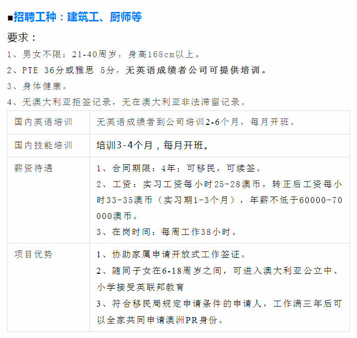 【澳洲工簽】 建筑工 廚師 火熱報名中......