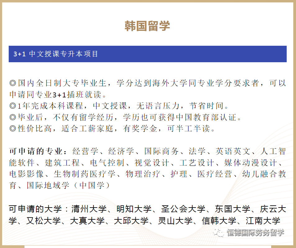 恒德國際——韓國留學 3+1中文授課專升本項目來啦!